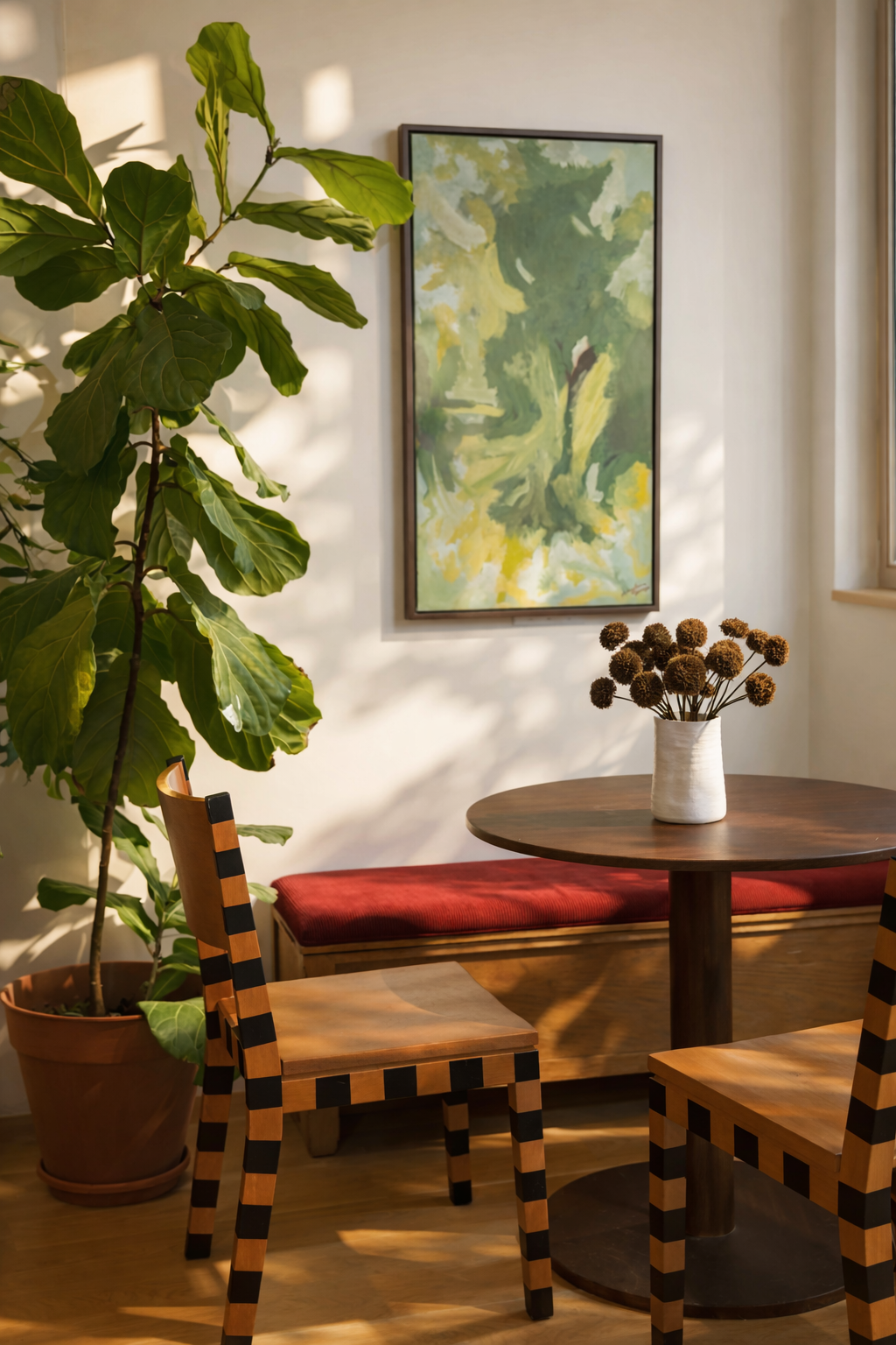 This project uses bold, intentional color to create a warm, balanced space with depth and visual interest. Custom elements ground the design, including striped black-and-wood chairs that add graphic contrast and a custom wooden art piece above the couch that pulls warmth upward and ties the palette together.