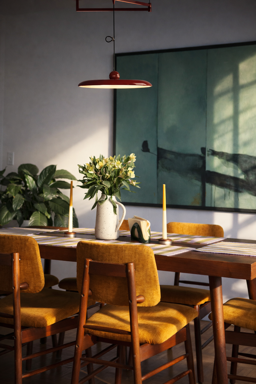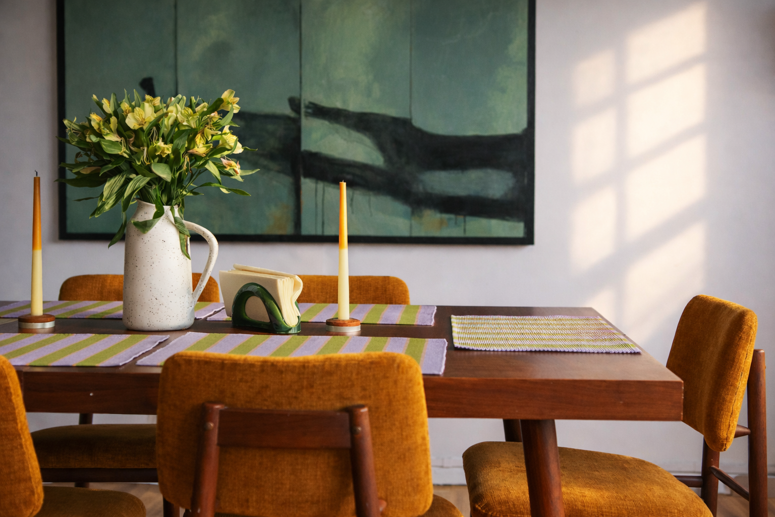 A downtown dining room with a classic walnut table, ochre velvet chairs, and bold abstract art, balancing eclectic warmth with modern simplicity.